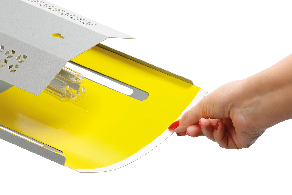 This high-quality, stainless steel insect trap can be used as a stand-alone device or for wall mounting, depending on your needs. The combination of a UV-A bulb and an adhesive film eliminates insects quietly, economically and effectively.