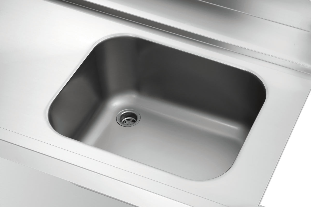 The 1.2 m wide pre-cleaning with sink is designed for left-side attachment to the Bartscher feed-through dishwashers DS. A base shelf offers storage space for dishwasher baskets.
