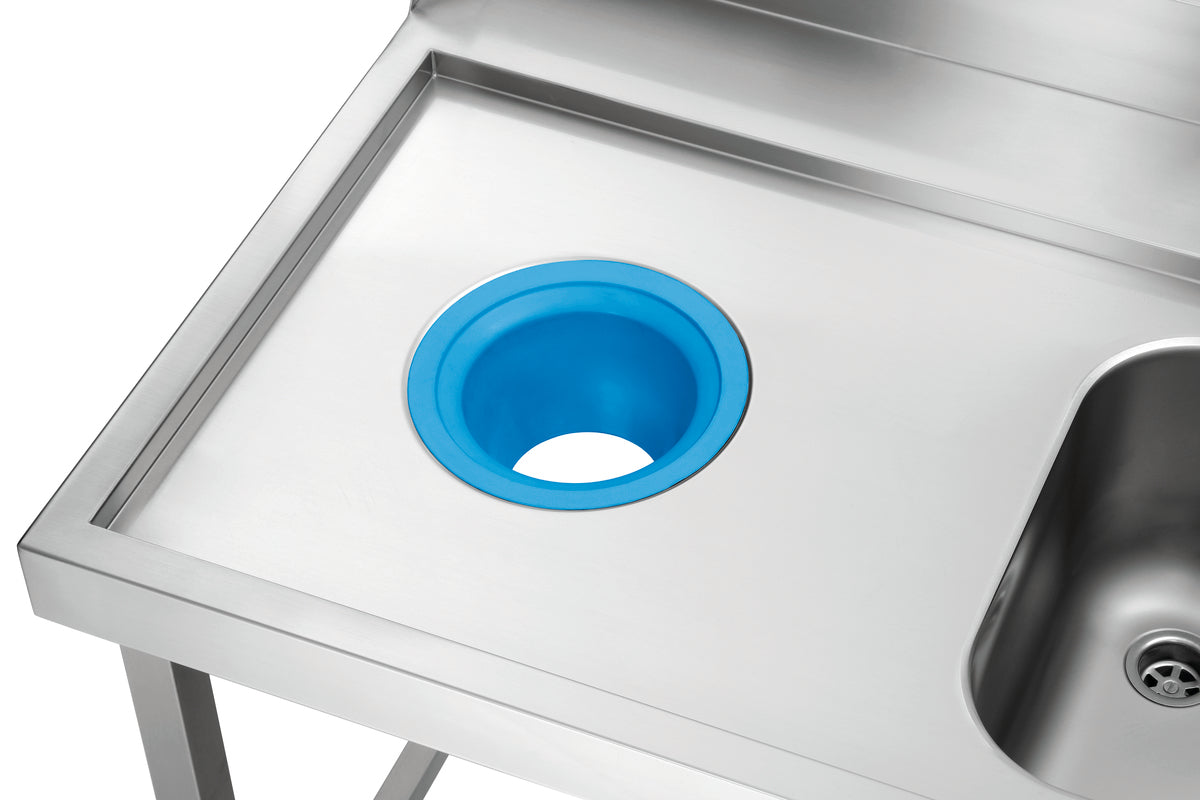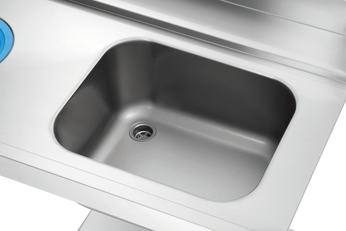 The 1.2 m wide pre-cleaning with sink and waste chute is designed for left-side attachment to the Bartscher feed-through dishwashers DS. A base shelf offers storage space for dishwasher baskets.