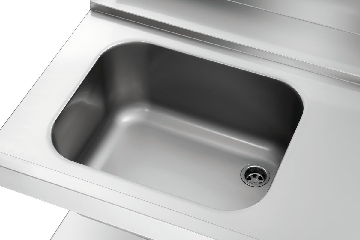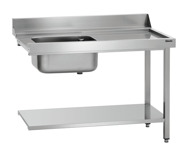 The 1.2 m wide pre-cleaning with sink is designed for right-side attachment to the Bartscher feed-through dishwashers DS. A base shelf offers storage space for dishwasher baskets.
