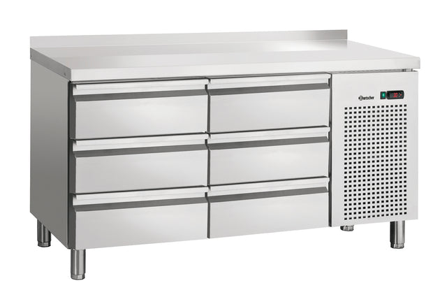 One appliance, two uses: The convection cooling ensures a constant, even refrigeration temperature inside this six-drawer refrigerated counter. Thanks to its high-quality and robust stainless steel surface, the appliance can be integrated perfectly into any kitchen and can also be used as a work surface.