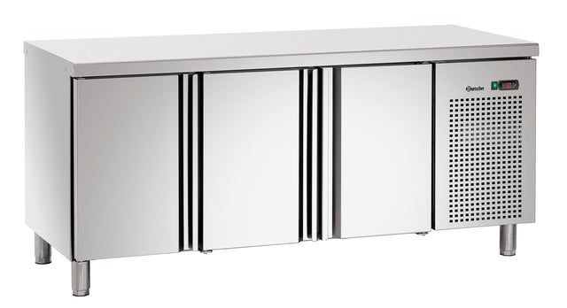 3-door refrigerated counter with high-quality stainless steel work surface and a large circulating air-cooled area - constant and even cooling temperature inside.