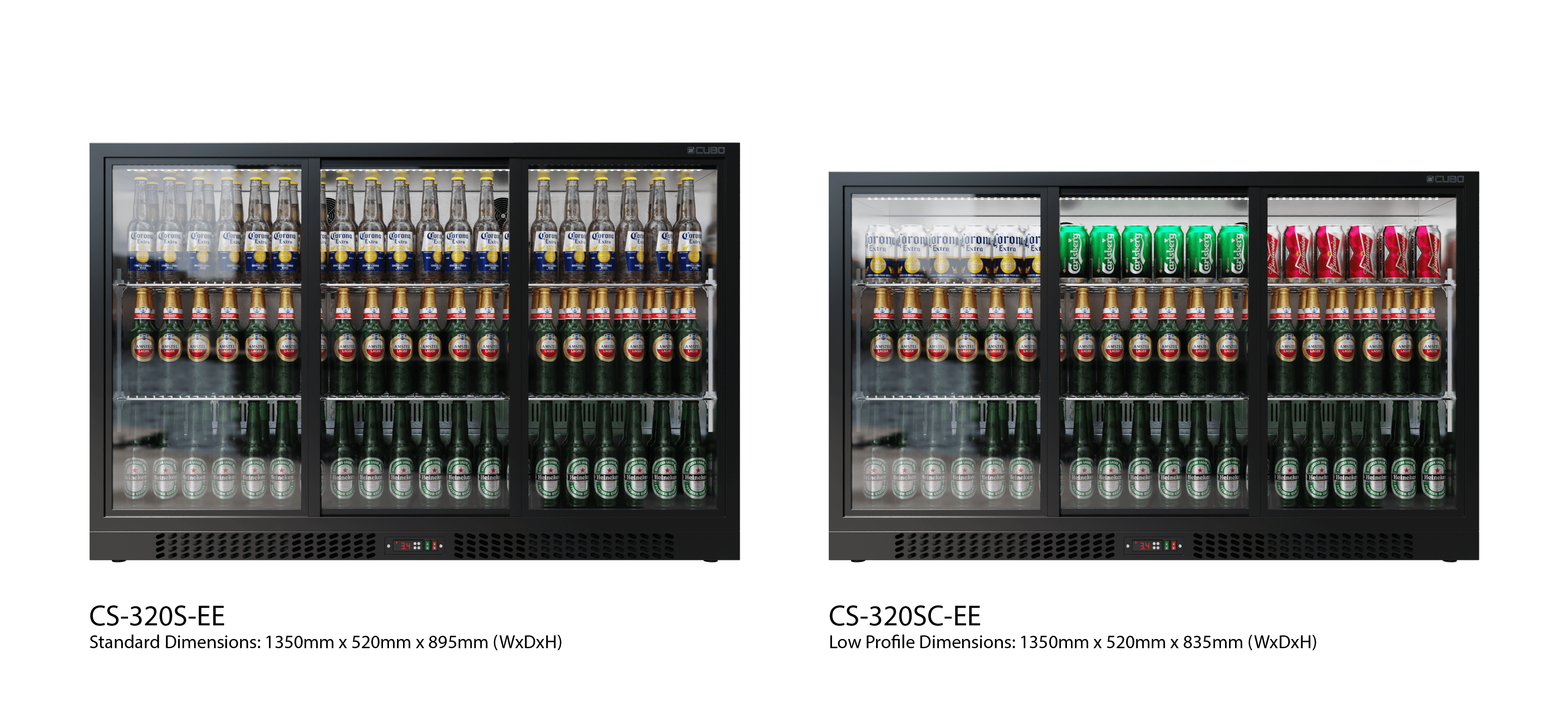 Größe 1350 B x 520 T x 895 H mm. Fassungsvermögen 315 x 330 ml Flaschen. LED-Beleuchtung. Energieeffizienzklasse C. Antibeschlag-Low-E-Glas, entspricht Dreifachverglasung