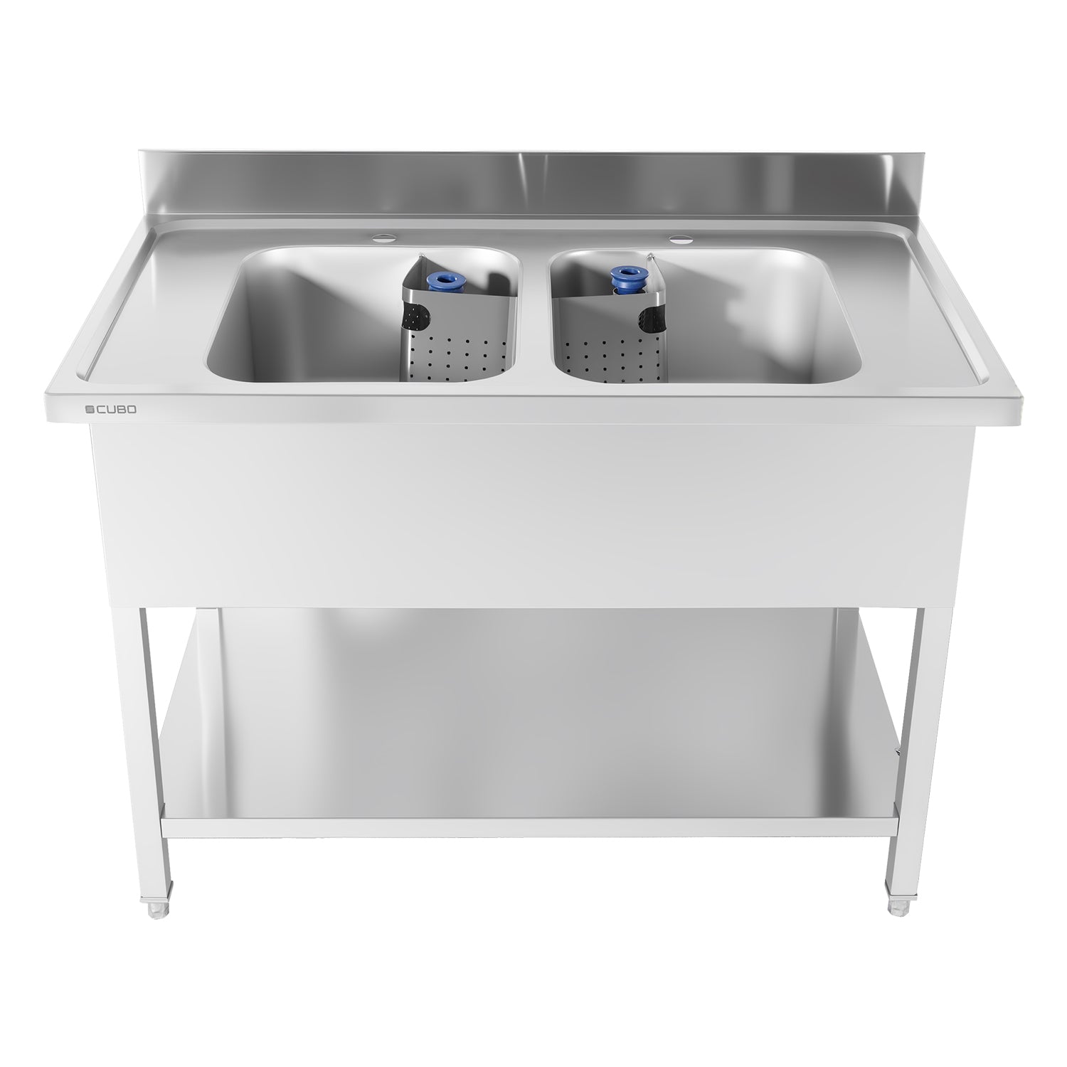 This CUBO double sink is ideal for restaurants, commercial kitchens, catering businesses, and food preparation areas that require a durable, hygienic, and high-capacity washing station with larger bowls.