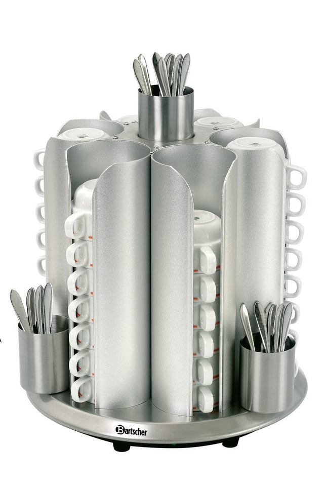 Koffiekopjes en lepels binnen handbereik. In de kopjeswarmer met praktische draaivoet kunnen tot wel 48 koffiekopjes tegelijk warm worden gehouden.